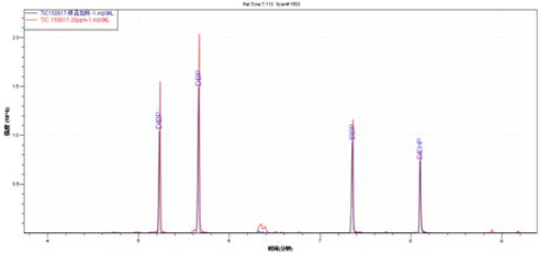 樣品TIC圖(藍色)與多溴聯苯醚混標TIC圖(紅色)