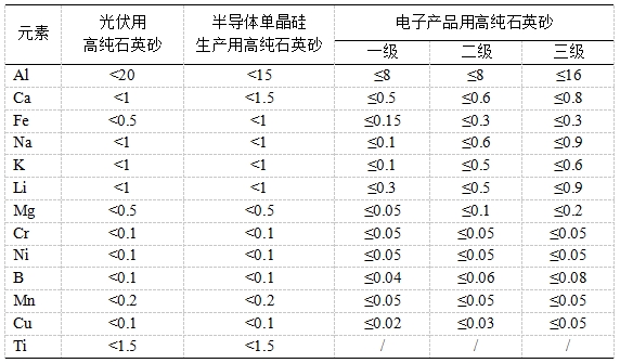石英砂中雜質元素限值(單位:μg/g)