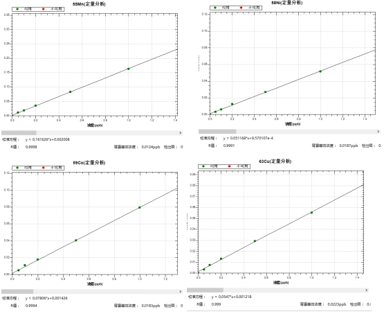 冷焰模式下,繪制各元素0,0.05,0.1,0.2,0.5,1.0μg/L系列濃度標液工作曲線,39K、40Ca、56Fe等同位素的線性相關系數r均大于0.999,背景等效濃度為0.0023μg/L~0.0217μg/L。