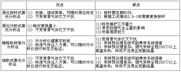 脫硝氨逃逸濃度的量級一般都是幾個ppm,對其準確測量比較困難。目前國內外用于煙氣脫硝系統氨逃逸在線監測的方法主要有以下幾種,優缺點如下: