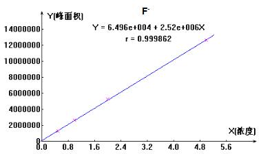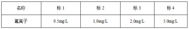 依次用移液槍移取氟離子標準溶液(1000mg/L)0.05mL、0.1mL、0.2mL、0.5mL于4個100mL的容量瓶中,用超純水定容至刻度并搖勻,各標準曲線的濃度詳見表1,氟離子的曲線方程及線性如圖2所示。