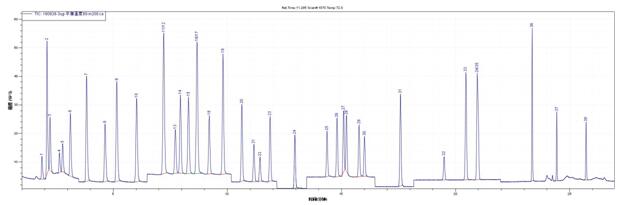 1. α-六六六;2. β-六六六;3. γ-六六六;4. 蒽-D10(內(nèi)標(biāo));5. δ-六六六;6. 七氯;7. 艾氏劑;8. 環(huán)氧七氯B;9. γ-氯丹;10. 硫丹I;11. α-氯丹;12. 4,4'-DDE;13. 狄氏劑; 14. 異狄氏劑;15. 硫丹 II;16. 4,4'- DDD; 17. 異狄氏醛;18. 硫丹硫酸酯;19. 4,4'-DDT;20. 異狄氏酮; 21. 甲氧DDT;22. 苝-D12(替代物);