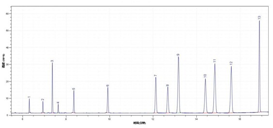 圖2 13種有機(jī)氯標(biāo)準(zhǔn)溶液TIC圖